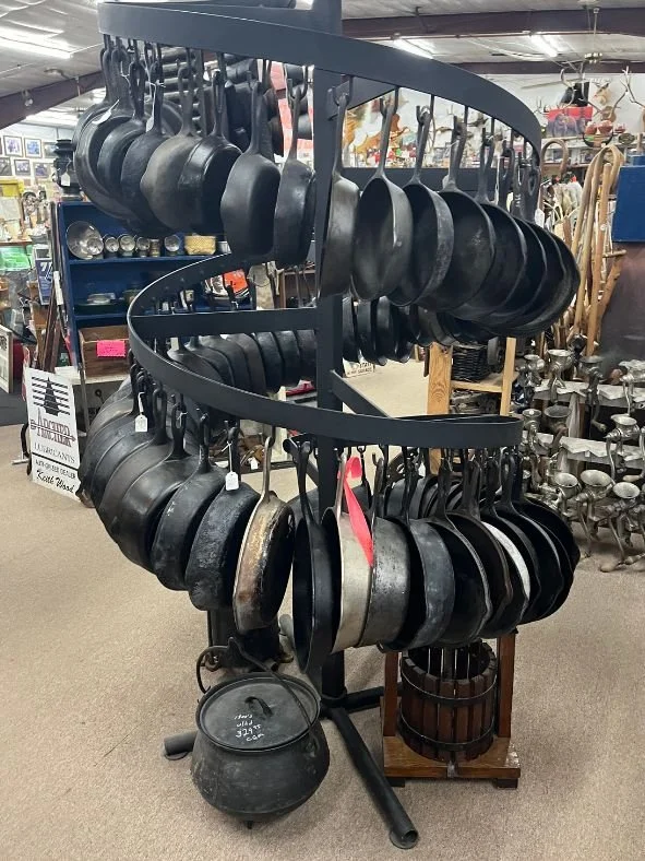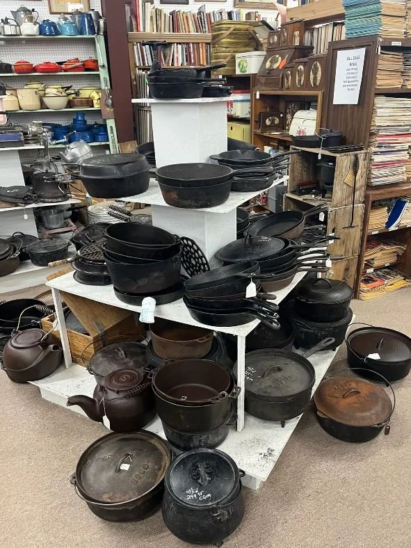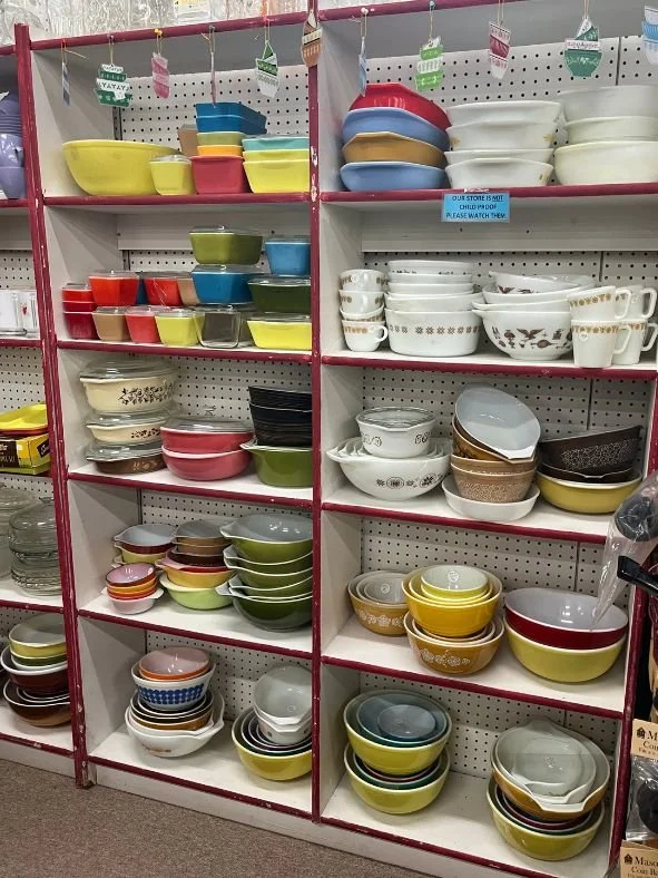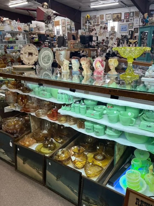 Our antique store boasts an impressive selection of glassware and household items in a spectrum of colors and styles. From vibrant Fiesta and Pyrex to classic jadeite and carnival glass, we offer an extensive range of glassware for collectors and enthusiasts alike. But our housewares collection goes far beyond glass—explore our variety of cast iron, enamelware, small appliances, salt and pepper shakers, and cookie jars. We also carry unique treasures like silver, copper, milk bottles, vintage tins, and iconic blue jars. Many of these pieces are rare and hard to find, making them perfect for those seeking something truly special.