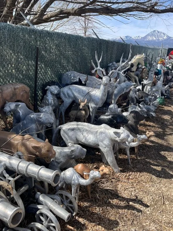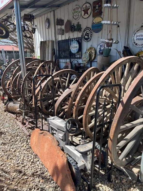 As you drive past the Antique Corral, you'll instantly notice our impressive selection of outdoor decor. From quirky, one-of-a-kind items like life-size aliens and Bigfoot figures to a variety of metal and cast iron animals in all shapes and sizes, there's something for every taste. If you're drawn to more rustic or antique decor, we also offer a large assortment of wagon wheels and metal buckets, perfect for adding charm and character to your space.